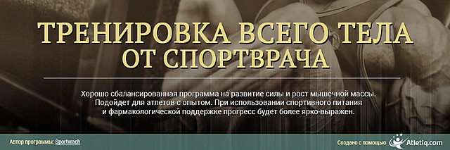 Fullbody-style training that perfectly fits into the training plan of the experienced natural "lifter" as a temporary "contrast" to the split-schemes. Accelerate training progress with an effective complex for the simultaneous development of all major muscle groups!Goal: