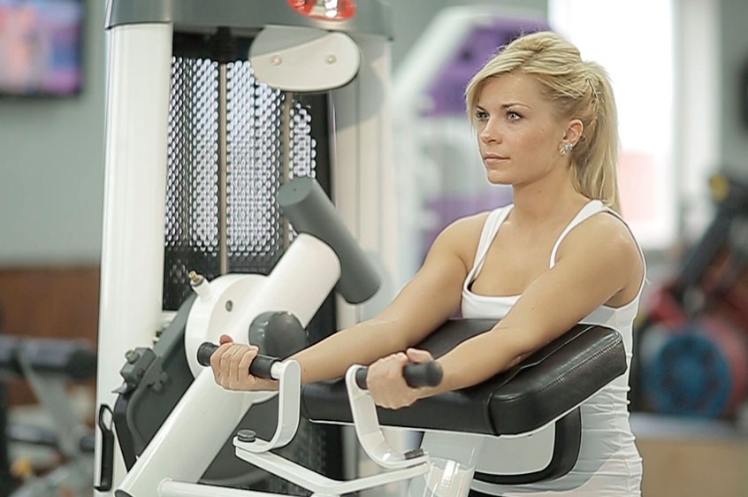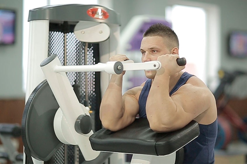 - Поставьте заднюю часть плеч (трицепсы) на специальную площадку и возьмитесь за ручки тренажера. Ладони должны быть направлены вверх. Это исходная позиция. Совет: при подъеме ручки ваши локти должны оставаться на площадке.